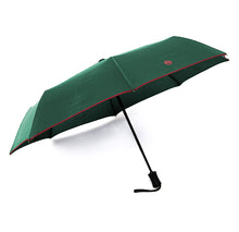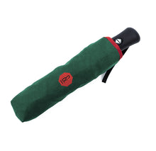 The dark green and orange Banvard & James fully automatic Roscoe telescopic Umbrella; exceptional quality and assembled by hand, it opens and closes simply with the push of a button and comes with matching cover.