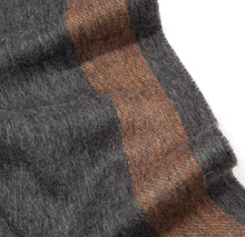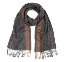 The grey and orange Tetbury scarf is woven using a blend of Cashmere and Merino wool, allowing both great durability and beautiful softness.