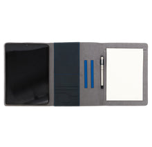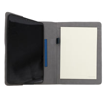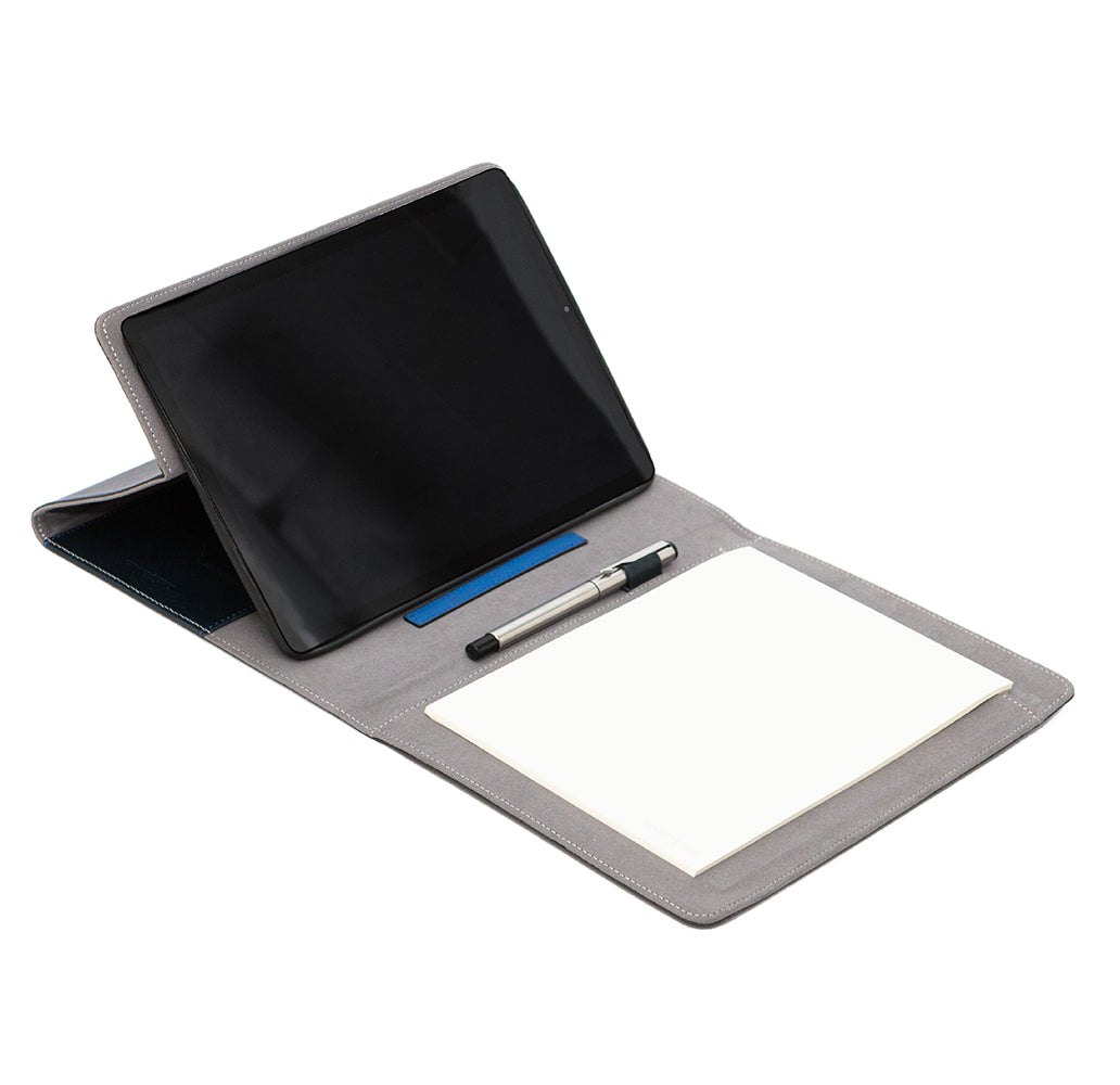 The left side panel features Gecko Tape for your tablet, the central panel has place for business cards, pockets for other papers and space for pen or stylus, and the right hand panel features a refillable A5 plain paper pad.